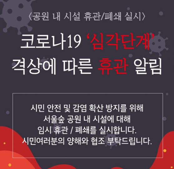 코로나19 대응 공원 내 시설 휴관/폐쇄 안내공지사항, 소식By 자원봉사협력팀2020년 02월 25일Leave a comment[서울숲 임시 휴관/폐쇄 안내] 코로나19 감염증 대응단계가 ‘심각단계’로 조정됨에 따라 감염 확산을 막기 위해 공원…