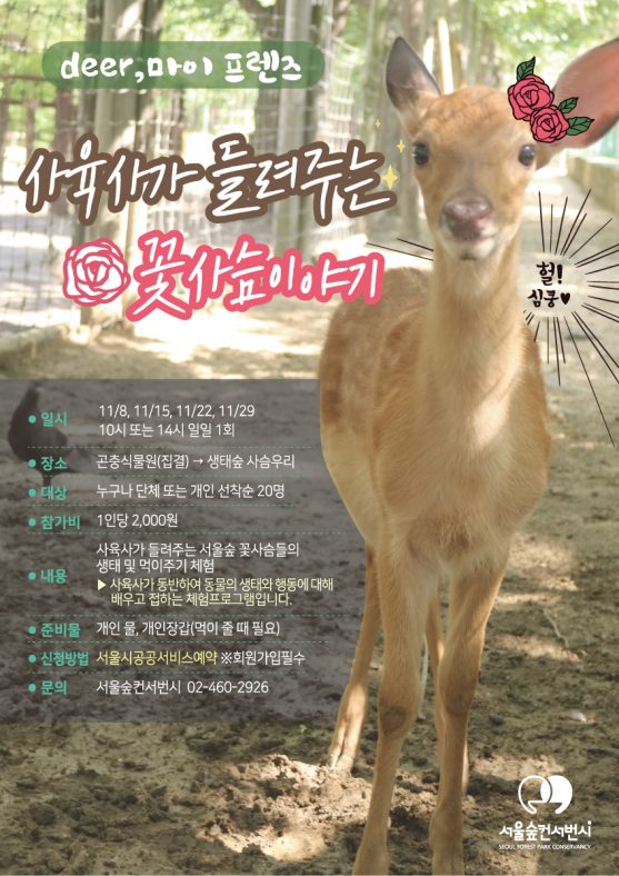 사육사가 들려주는 꽃사슴이야기프로그램By pg2018년 11월 03일Leave a comment사육사가 들려주는 꽃사슴이야기를 들으며, 서울숲에 사는 사슴과 친구가 되어 보아요 ▶ 사육사가 동반하여 동물의 생태와…
