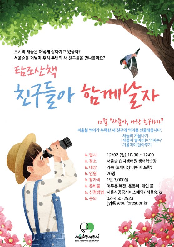 🐥탐조산책: 친구들아 함께날자서울숲 소식, 프로그램By pg2018년 11월 21일Leave a comment도시의 새들은 어떻게 살아가고 있을까? 서울숲을 거닐며 새친구들을 만나볼까요? “새들아, 나랑 친구하자!” 새 관찰을…