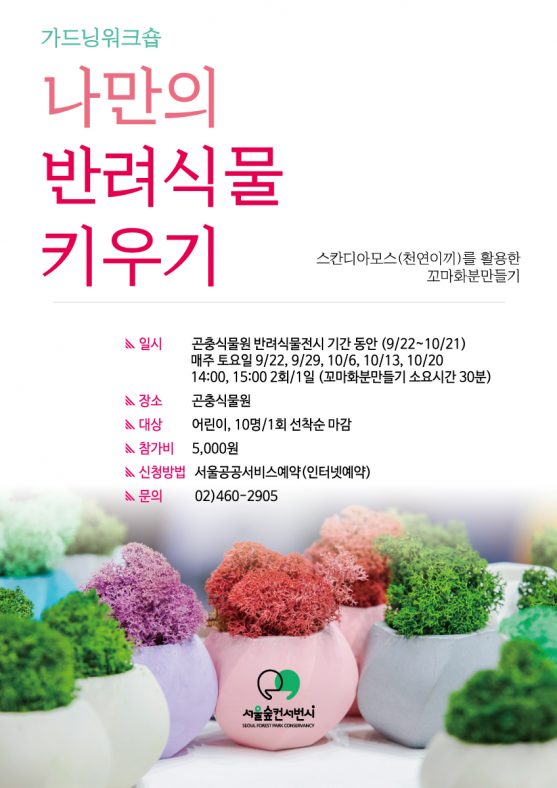 가드닝워크숍: 나만의 반려식물키우기프로그램By pg2018년 08월 28일Leave a comment 스칸디아모스(천연이끼)를 활용한 꼬마화분만들기 – 일 정 : 곤충식물원 반려식물전시 기간동안 (9/22~10/21) 매주 토요일…