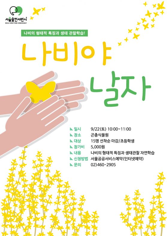 나비야날자 (자연관찰교실)프로그램By pg2018년 08월 28일Leave a comment 나비야 날자(자연관찰교실) ▶ 나비의 형태적 특징과 생태관찰 자연학습 일 정 : 9/22(토) 10:00~11:00 집결장소 :…