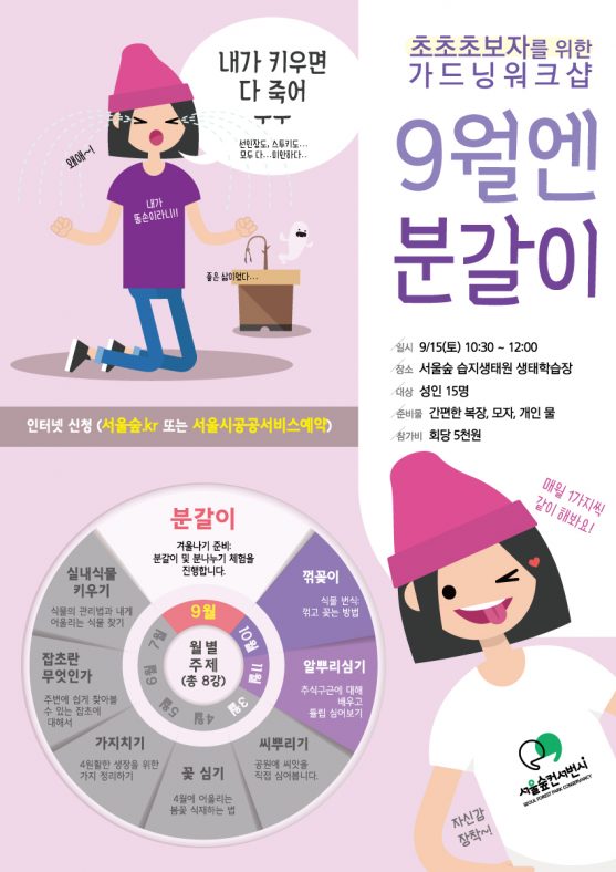 🌿9월엔 분갈이: 가드닝워크샵서울숲 소식, 프로그램By pg2018년 08월 30일Leave a comment선인장도 스투키도… “내가 키우면 다죽어ㅠ ㅠ” 그럼 우리 같이 키워볼까요? 🍃 초.초.초보자를 위한 가드닝워크샵! 식물이…