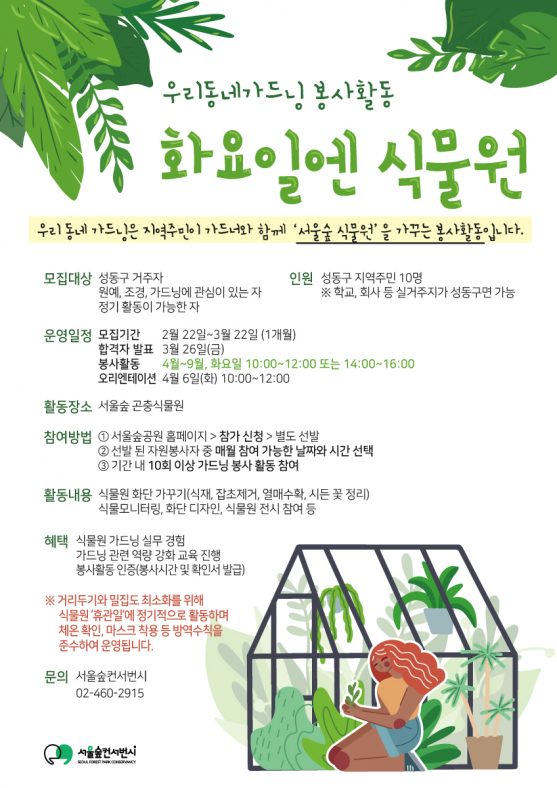 👩🌾 우리 동네 가드닝 봉사활동 <화요일엔 식물원> 모집공지사항, 자원봉사By seoulforest2021년 02월 22일Leave a comment 서울숲 우리동네 가드닝 봉사활동 <화요일엔 식물원> 참여자를 모집합니다. 흙을 만지고 식물을 가꾸면 스트레스와 자연스럽게…