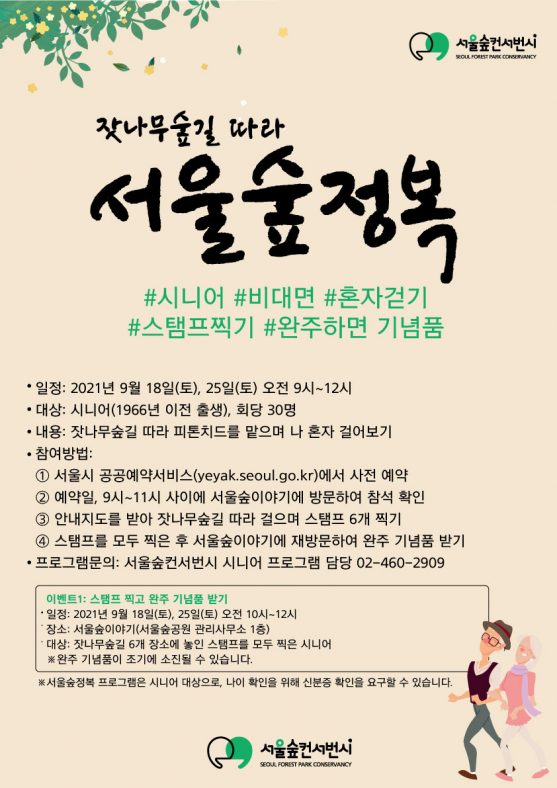 잣나무숲길 따라 서울숲 정복 주말판(시니어대상)공지사항, 프로그램By pg2021년 09월 09일Leave a comment잣나무숲길 따라 서울숲 정복(시니어대상) #비대면 #혼자걷기 #스탬프 찍기 # 완주하고 기념품 받기 -일정 : 2021.…