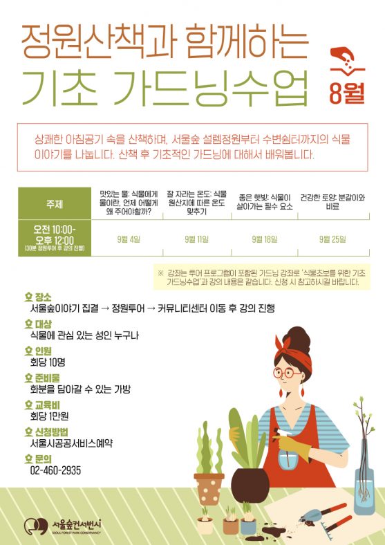 [저녁반]식물초보를 위한 가드닝수업서울숲가이드, 프로그램By pg2021년 08월 18일Leave a comment“매 회 가드너에게 식물이야기를 듣고, 가드너와 함께 식물을 심어갑니다.” 1. 일 시 | 9월…