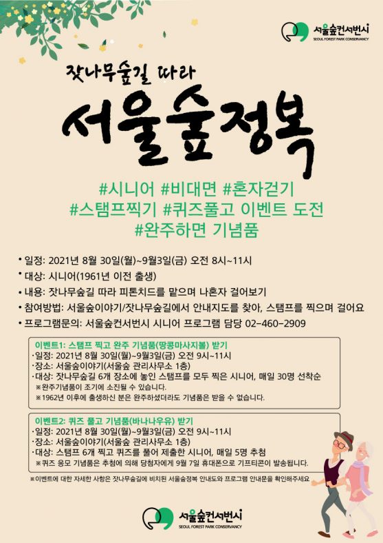 잣나무숲길 따라 서울숲 정복(시니어대상)프로그램By pg2021년 08월 18일Leave a comment잣나무숲길 따라 서울숲 정복 #비대면 #혼자걷기 #스탬프 찍기 # 퀴즈 이벤트 # 완주하고 기념품 받기…